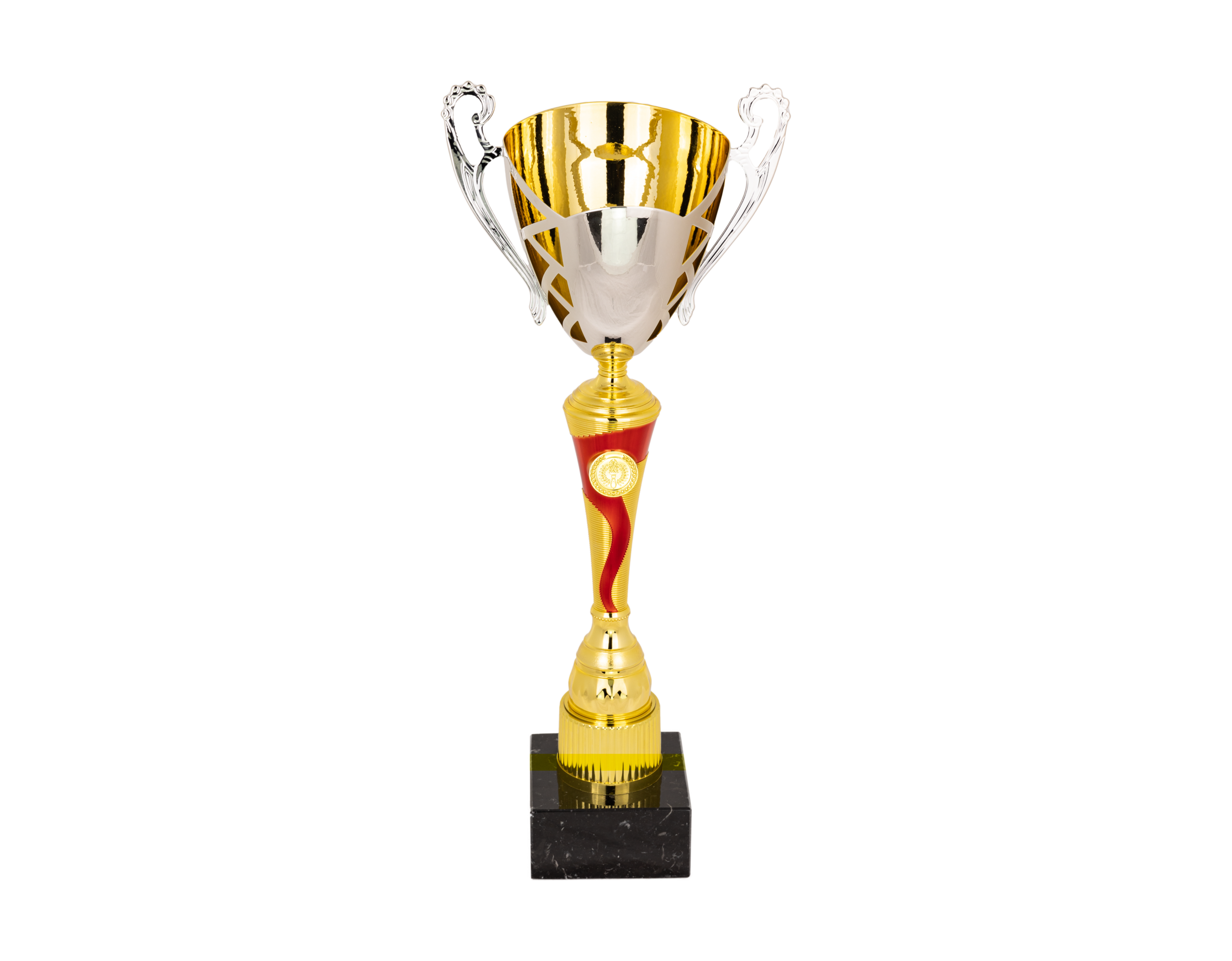 Puchar metalowy złoto-srebrny z uszami na marmurze.