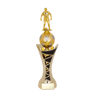 Puchar złoto-czarny z z piłką nożną oraz figurką piłkarza.
