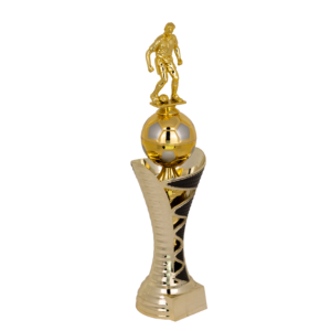 Puchar złoto-czarny z z piłką nożną oraz figurką piłkarza.