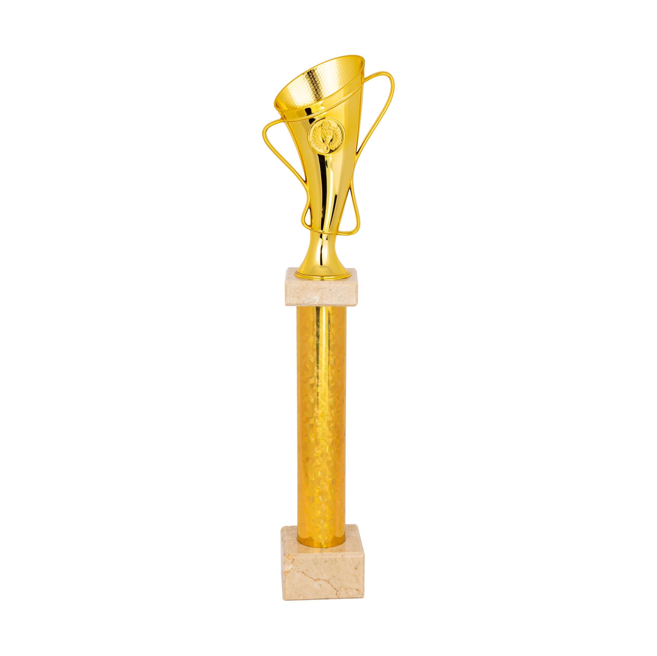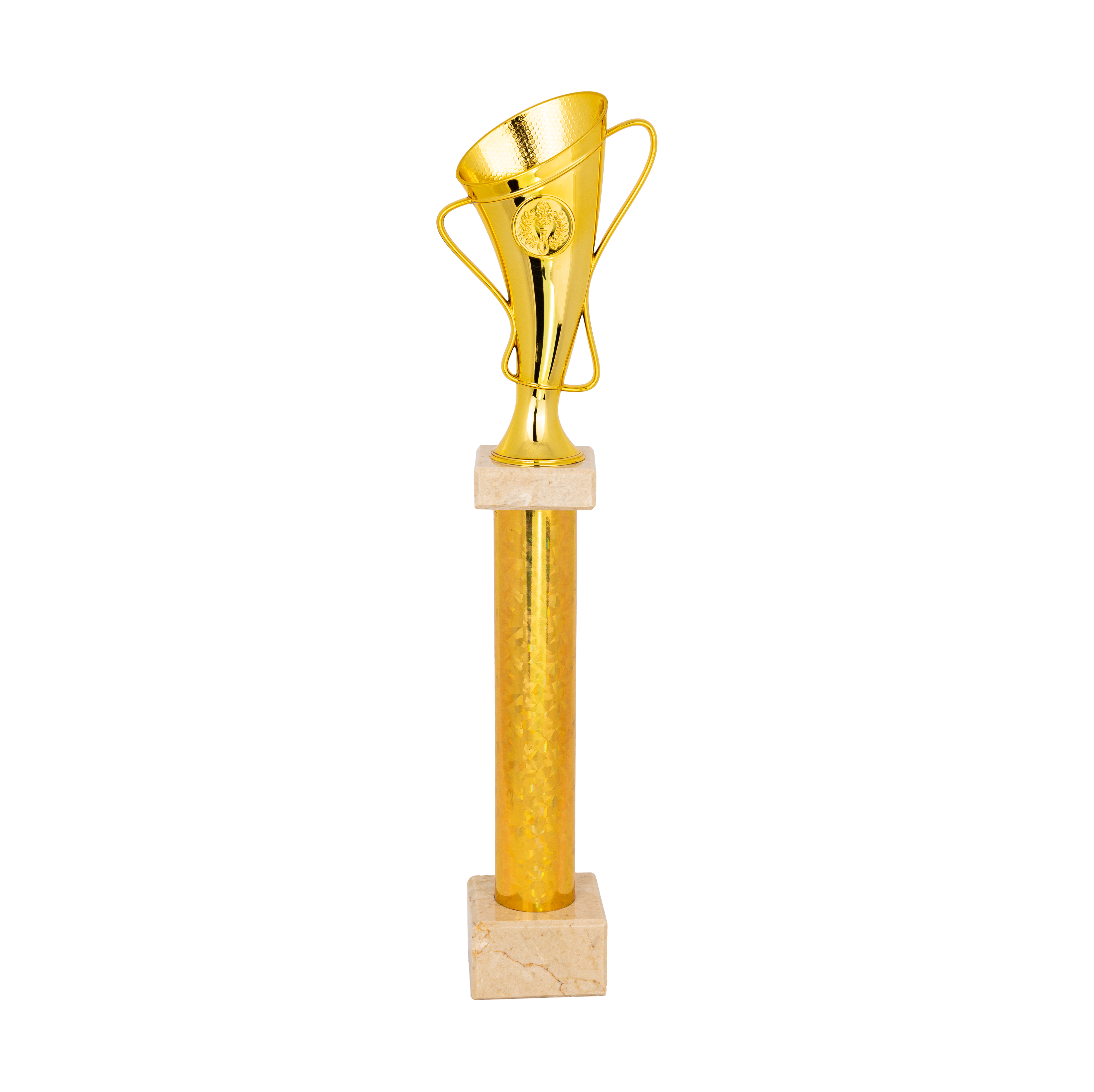 Puchar złoty, filarkowy na białym, marmurowym postumencie, z miejscem na wklejkę.