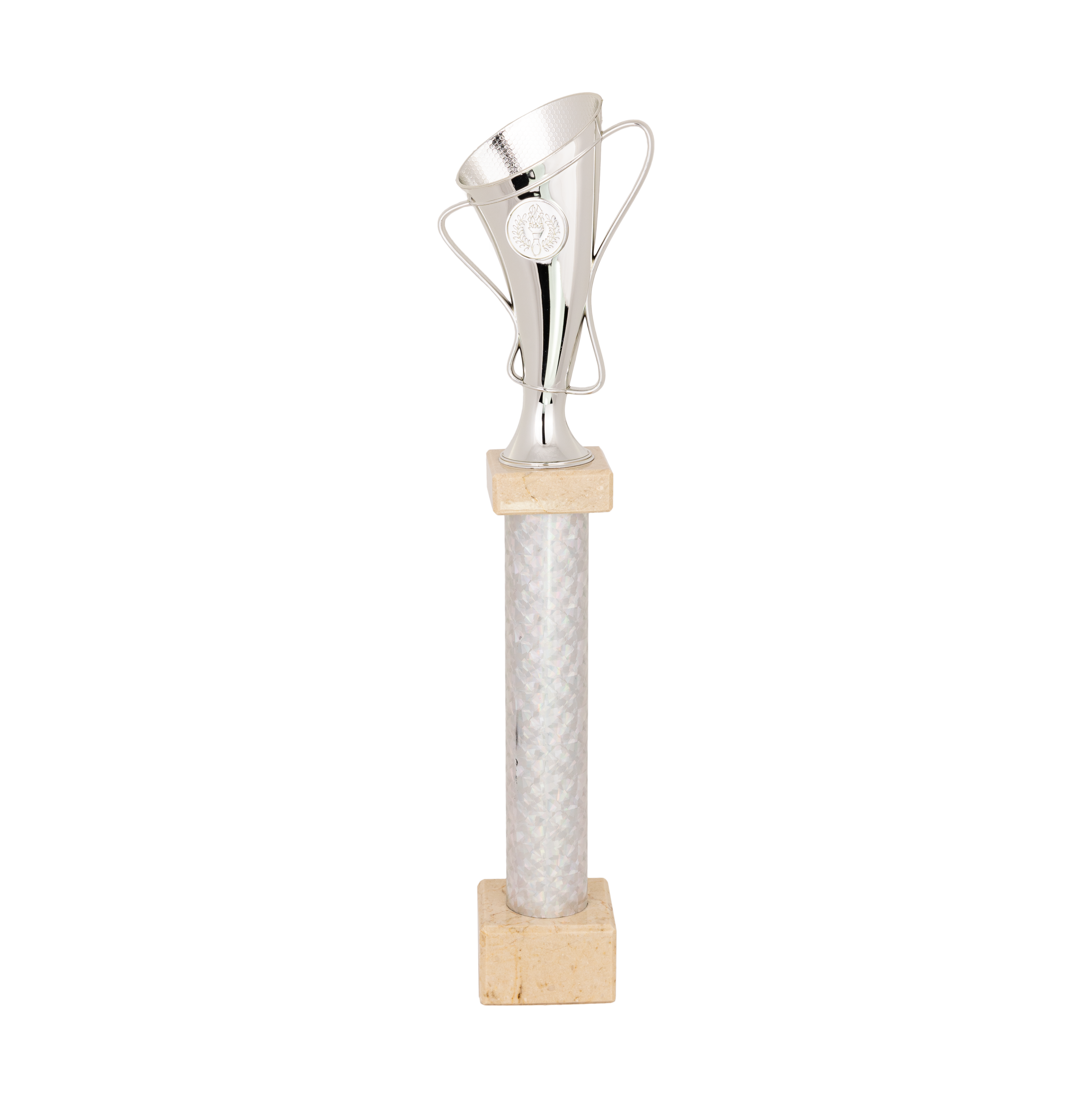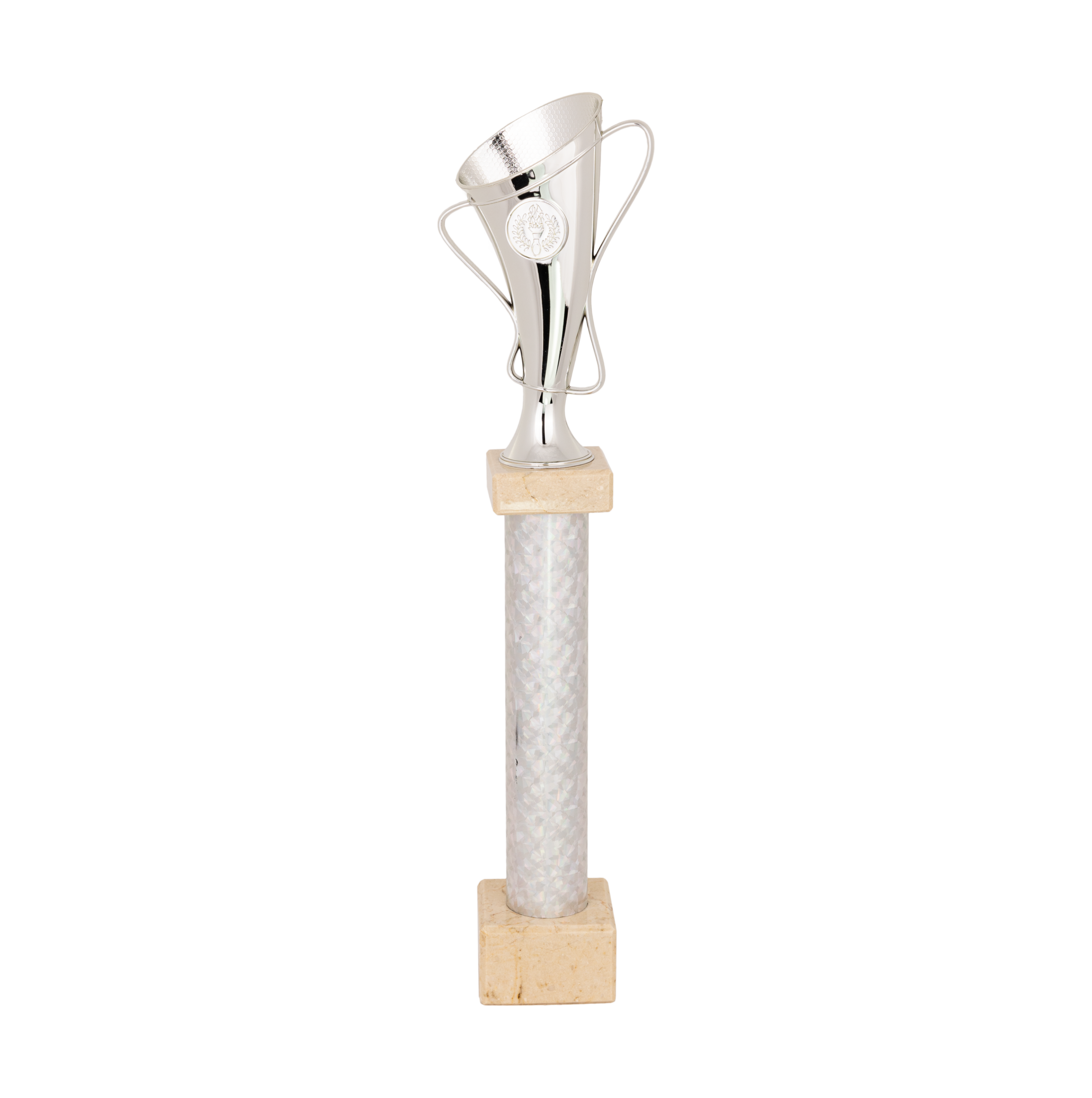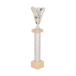 Puchar srebrny, filarkowy, na białym, marmurowym postumencie, z miejscem na wklejkę.