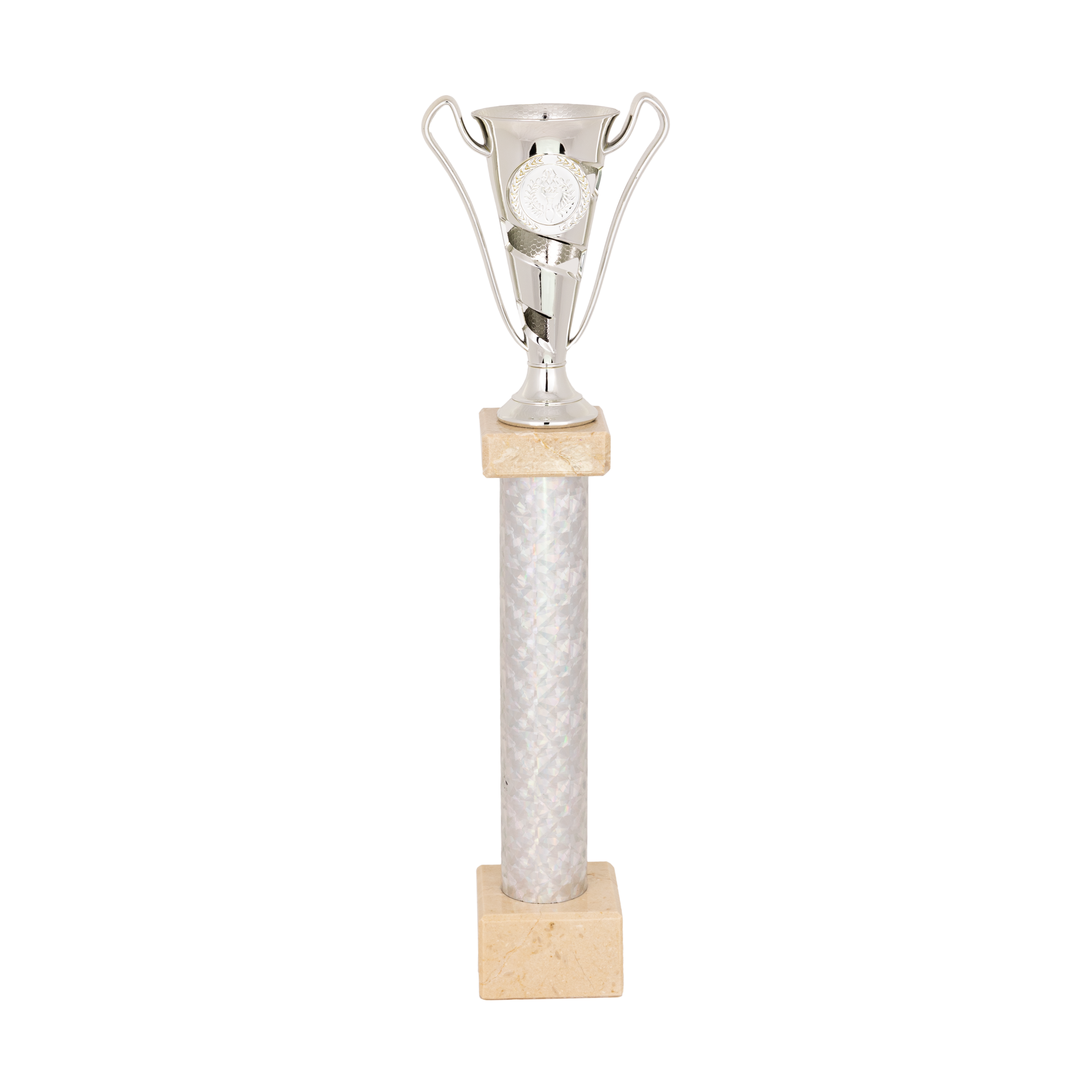 Puchar srebrny, filarkowy, na białym, marmurowym postumencie, z miejscem na wklejkę.