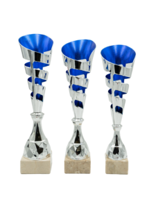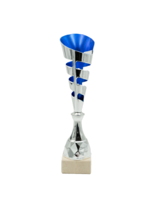 Plastikowy puchar srebrno-niebieski na białym marmurowym postumencie.