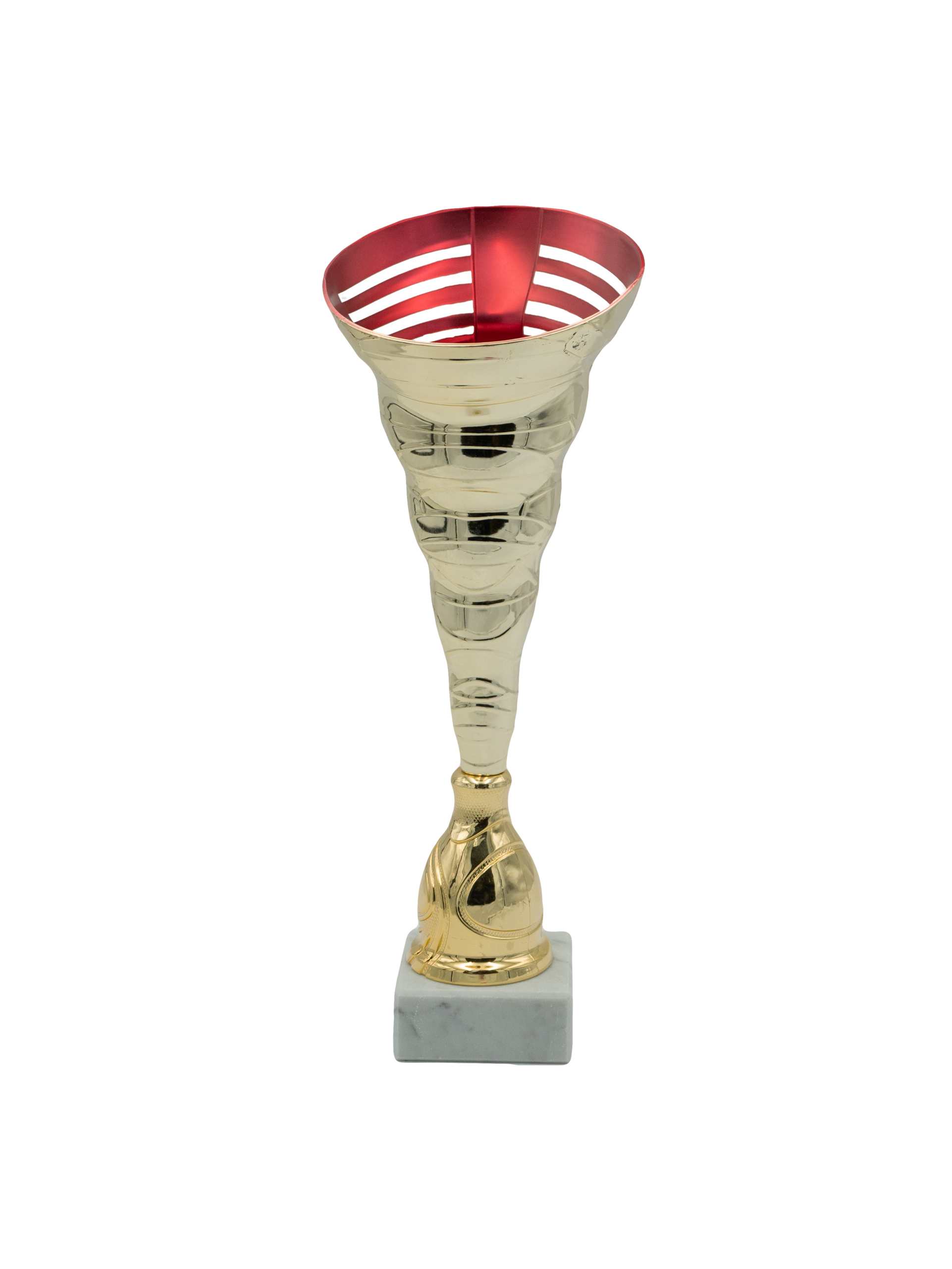 Plastikowy puchar złoto-różowy na białym marmurowym postumencie.