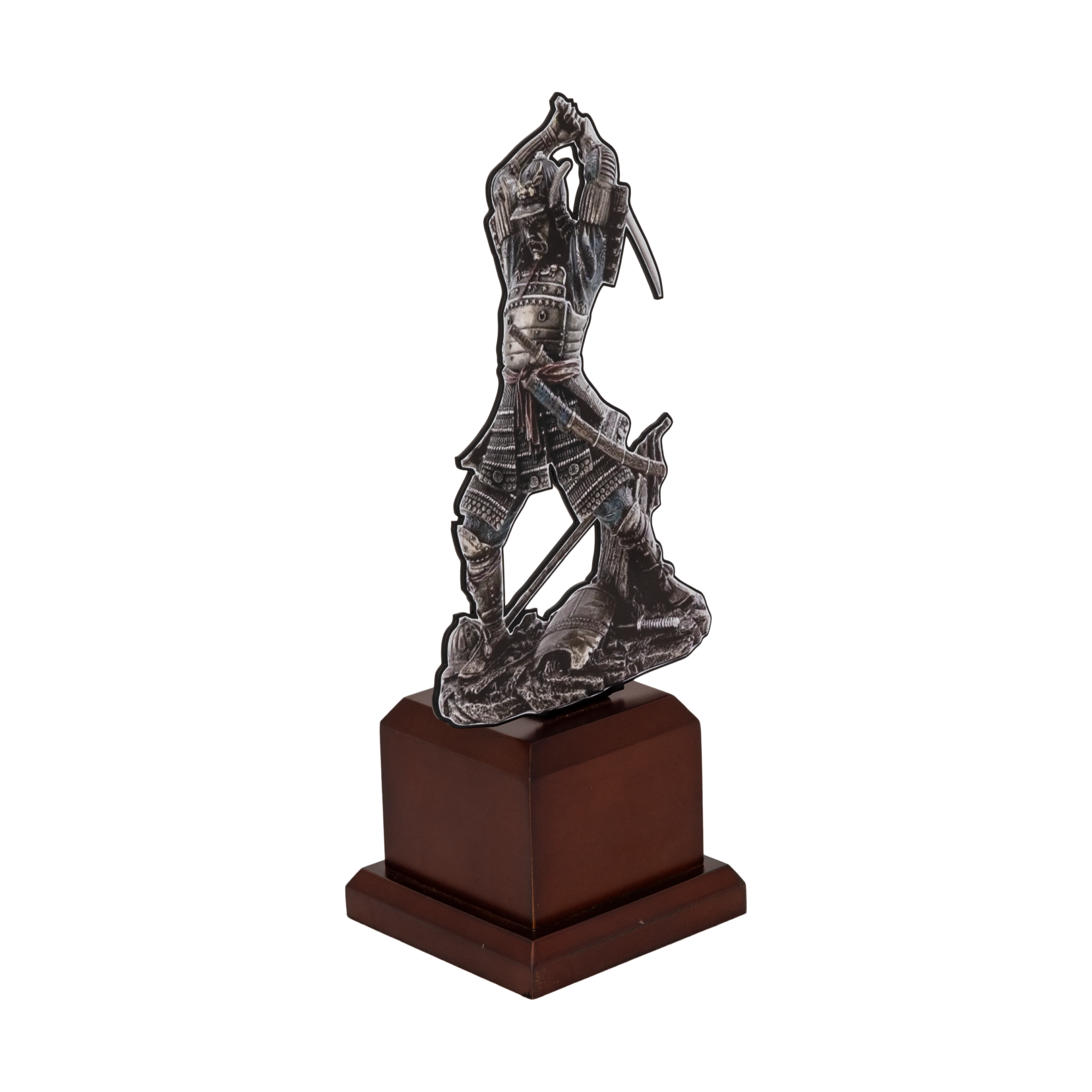 Statuetka w kształcie samuraja na eleganckim postumencie.