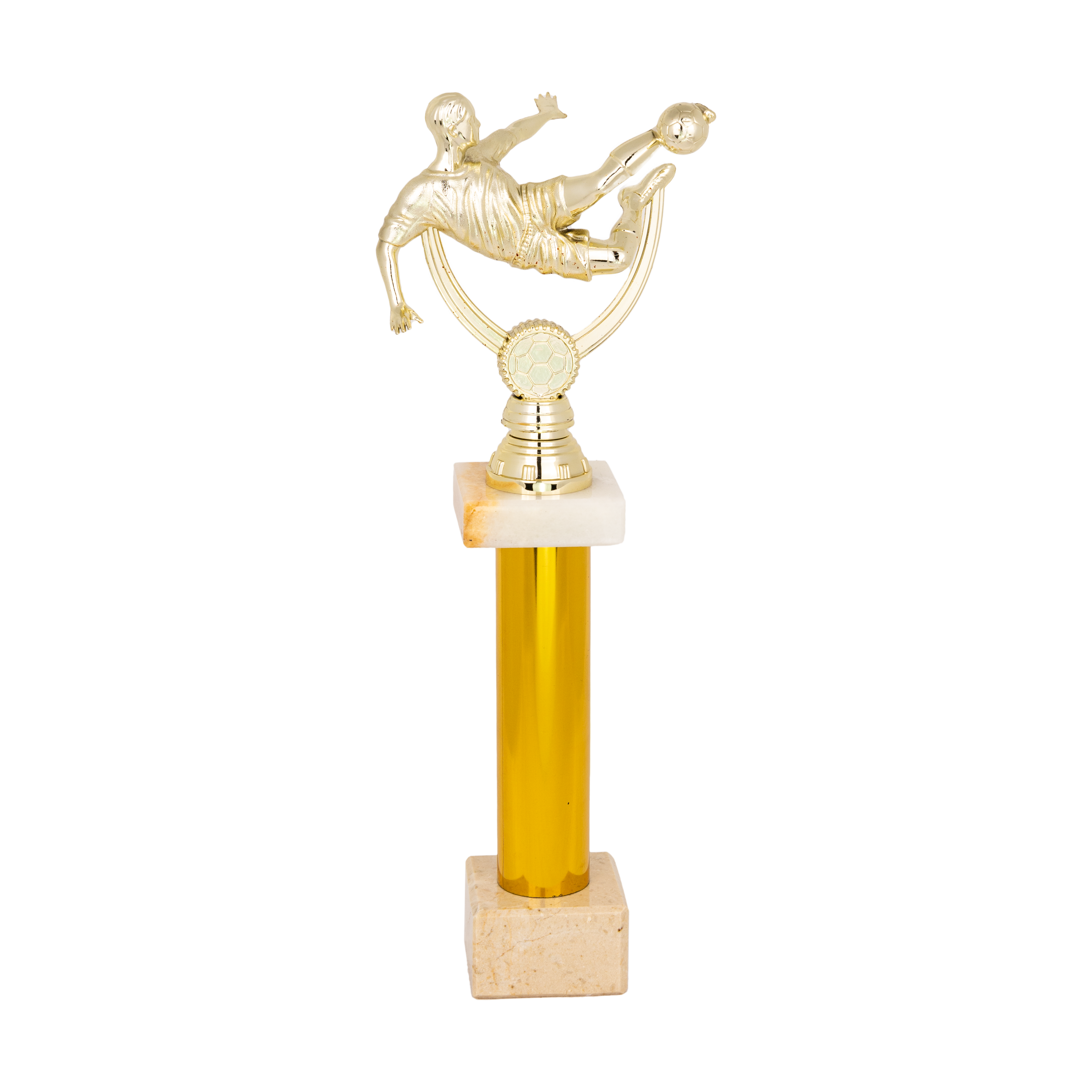 Statuetka piłkarska na marmurowym postumencie.